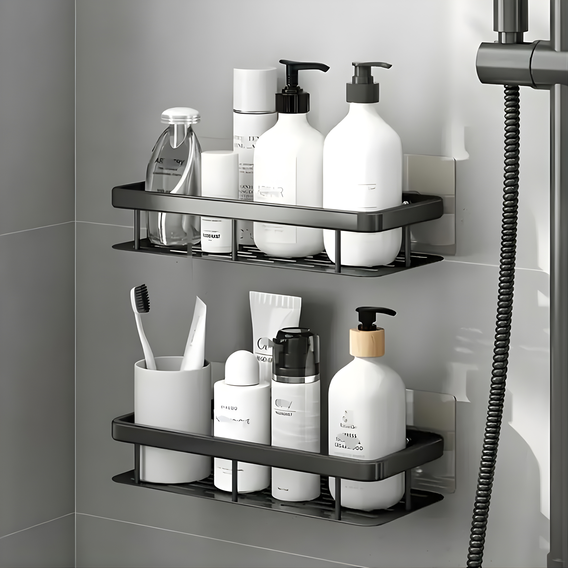 Adhesive Bathroom Shelf Organizer | No Drill Wall Mounted Storage Rack | Waterproof & Rustproof | Bathroom & Kitchen Organizer (Black, Powder Coated)
