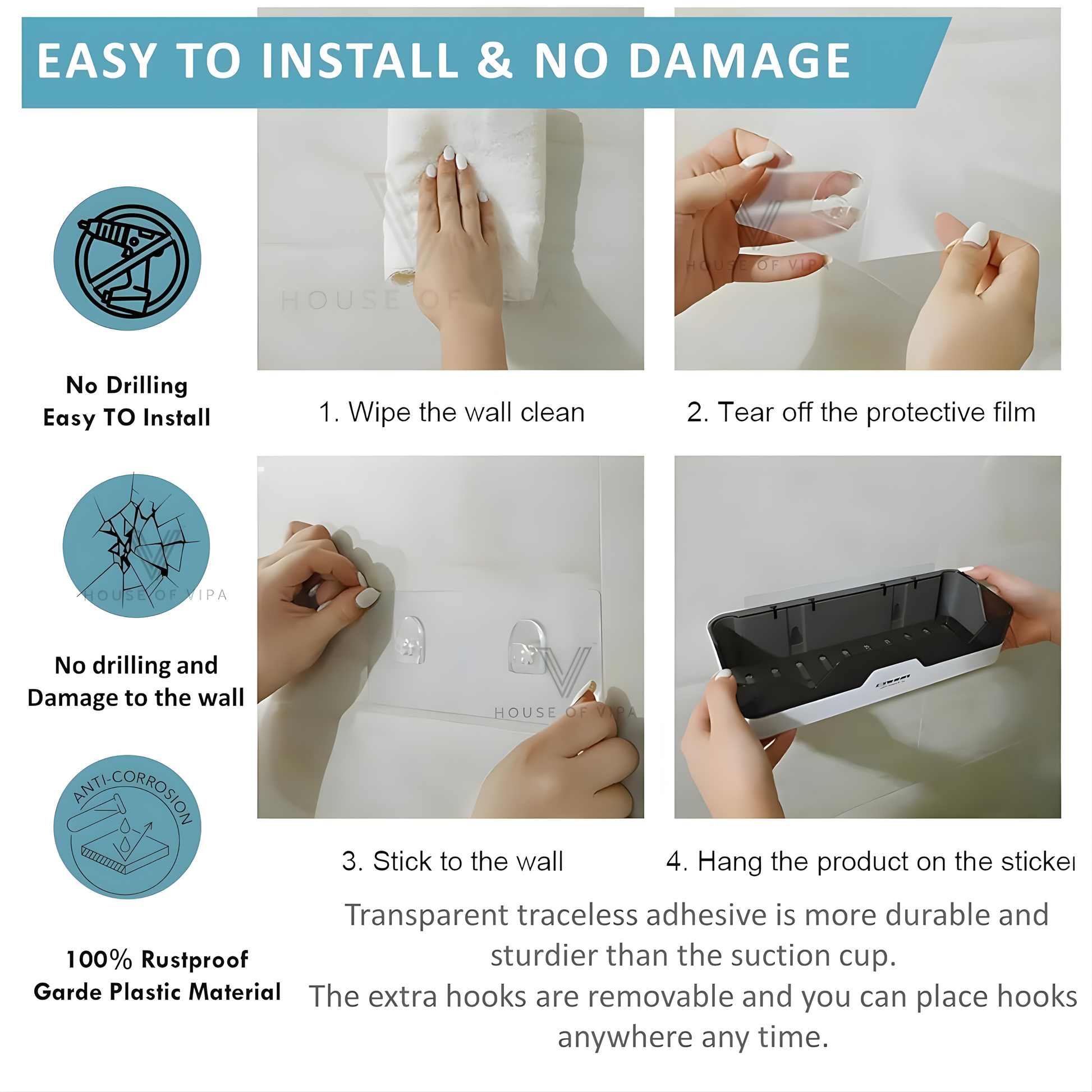 When installed on a clean, smooth surface and used after 12 hours, it can easily hold daily bathroom or kitchen essentials like shampoo bottles, toiletries and spice jars.